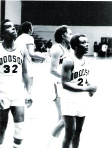 H. Bell and Bill Raspberry shoots hoops during half time of charity basketball game played at Georgetown University