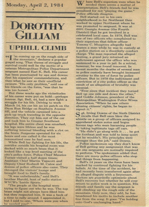 On April 2, 1984 Washington Post columnist Dorothy Gilliam wrote a column on Sgt. Earl K. Bell and the trials and tribulations of a good cop against all odds. Sgt. Irving Downs of the 6th District recalls that Bull Bell blew the whistle on a group of dirty cops who were using the system to benefit themselves. Sgt. Bell refused to look the other way and said, “Not on my watch.” The dirty cops were tried and convicted. His temporary assignment to the Police and Fire Clinic, was ‘Pay Back’ via Ike Fullwood.