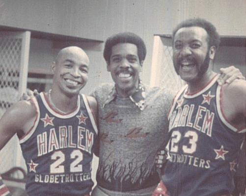 Old friends Harlem Globetrotters show stoppers, Curly Neal, ‘Jumping’ Jackie Jackson and I meet after a game in DC.