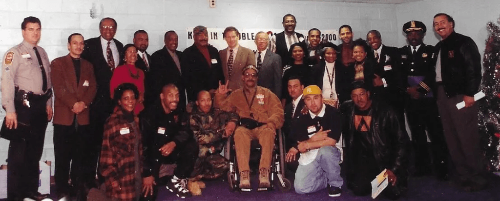 Thurston kneeling second from left at the Kids In Trouble Police/Youth Forum at Bible Way Church in DC. The late Jim Brown (NFL) and Congressman Tom Davis (R-Va) were the co-host.