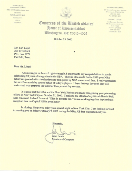 Letter from Congressman John Lewis letting us know he was a TEAM player.