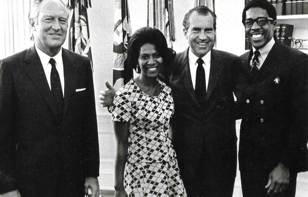SECRETARY OF STATE WILLIAM ROGERS LOOKS ON WHILE PRESIDENT RICHARD NIXON WELCOMES HATTIE T AND ME TO THE WHITE HOUSE.