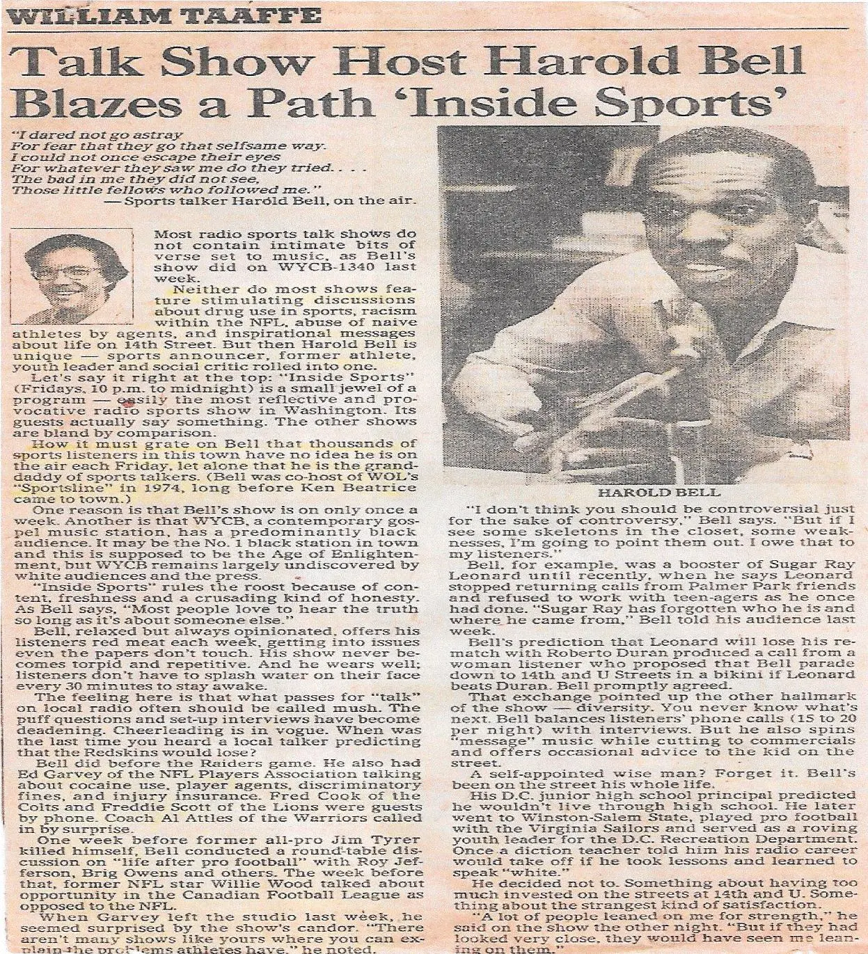 The Inside Sports tag was given to me by my wife Hattie at the dinner table the evening, it wasthe day before his radio debut. Inside Sports changed the way we talk and report sports in America. Bell, left Petey Greene and Bobby “The Burner” Bennett talk shows at WOL and found a new home at W-O-O-K Radio 1450 on the AM dial, thanks to his childhood friend, the legendary DJ, John Edwards aka “Terrible Turk.”