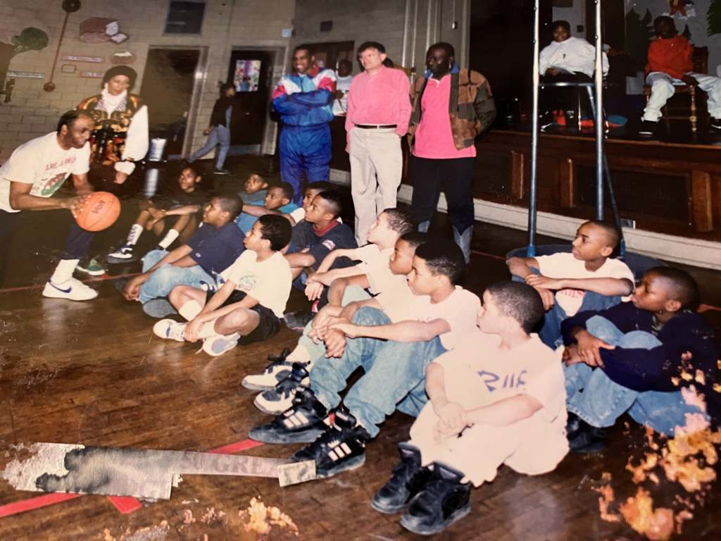 Before he became “Big Man on Campus” John Thompson is seen talking to a group of kids at one of my annual KIT Toy Parties. Look closely and you will see his son Ronnie under his right elbow.