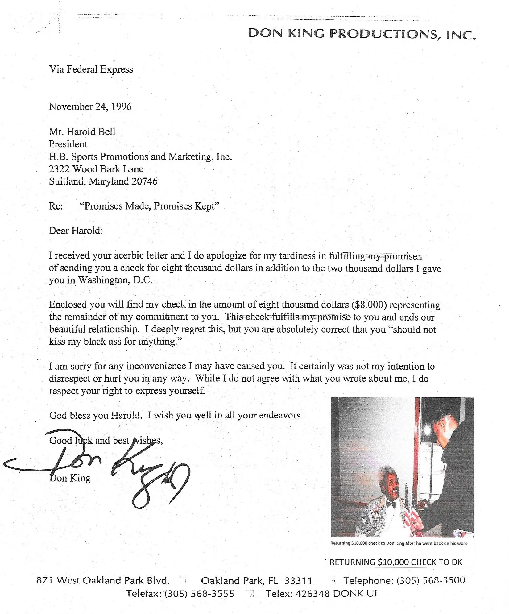 The fast talking and known scammer King mailed him a $10,000 check, saying, “Promises made, promises kept.” He waited for King to come to DC for a boxing promotion and gave the check back to him. King, had hired Bell’s younger brother William as his photographer, he took the photo of the transfer of the check.