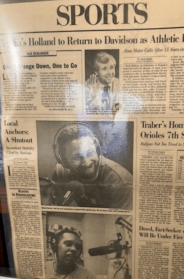 The Washington Post wrote two stories on me in the same 1989 edition (unheard of) after I said, “NO” to their first proposal. The first story on page one included all the blacks in sports talk radio in DC. The story on page three was on me alone. In that story Norman Chad the writer tricked Glenn Harris into commenting on my trailblazing journey in sports talk radio.