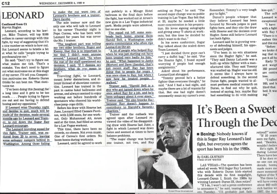 This is a story Janks Morton and Mike Trainer planted in the L A Times after I saw Ray slap Juanita in the back of a Las Vegas hotel before his second fight with Thomas Hearns. I found out later she discovered Ray had his other women sequestered in rooms on the strip.
