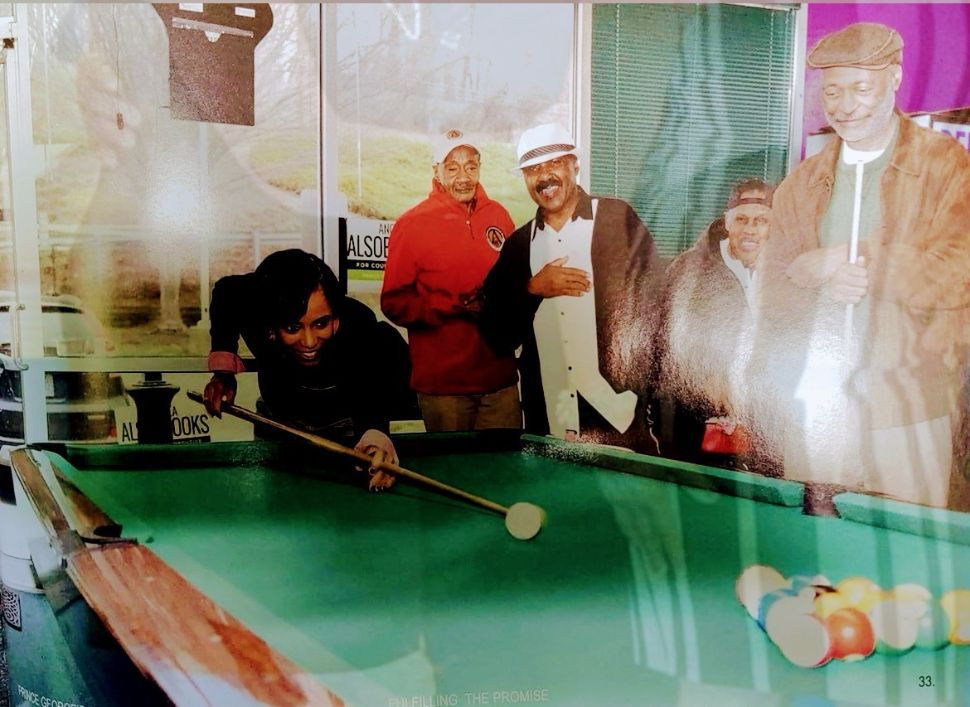 Prince George County Executive Angela Alsobrooks at Q Ball’s Pool Room on Central Avenue in District Heights, Md. Looking on as she takes aim, L-R ?-Toya Blake-HBell and proprietor Larry Steele. She is no stranger to a pool room. She was hanging out in the poolroom on Benning Road in NE DC with her father at the age of 7.