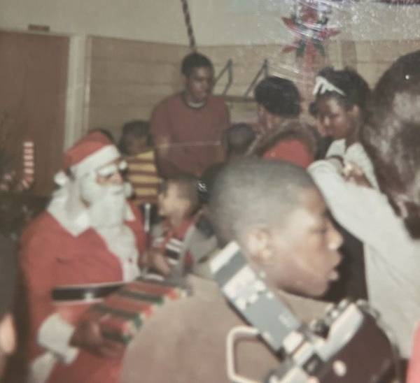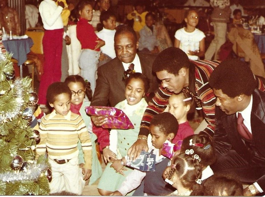 Former Spingarn High School basketball coach, the late Rev. William Roundtree looks on as former student/athletes, HBell and Byron Kirkley assist as Santa’s Helpers for his youth center.