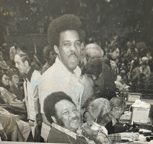 The late Ron Sutton, talk show host for WHUR Radio in DC. We share a laugh at a Washington Bullets’ game in Landover, Maryland.
