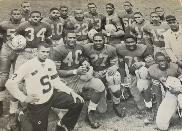 1957, the teammates are still in the struggle. Lucas No. 55 standing on the back row, left, and HB on the back row with a helmet under my arm.