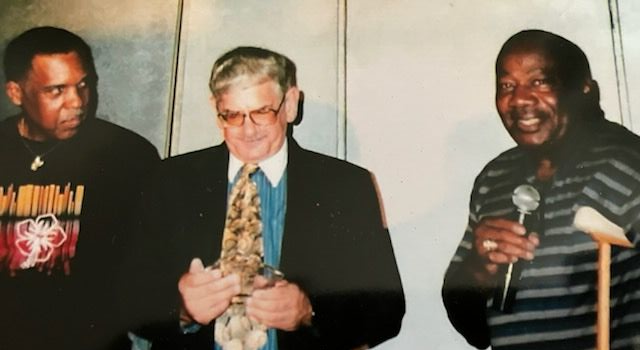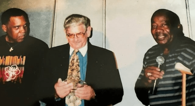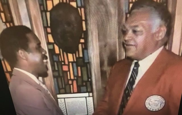 I look on as NFL HOF player and Green Bay Packer great, Willie Wood honors DC legendary sportswriter, Dick Heller with the Kids In Trouble Community Service Award.