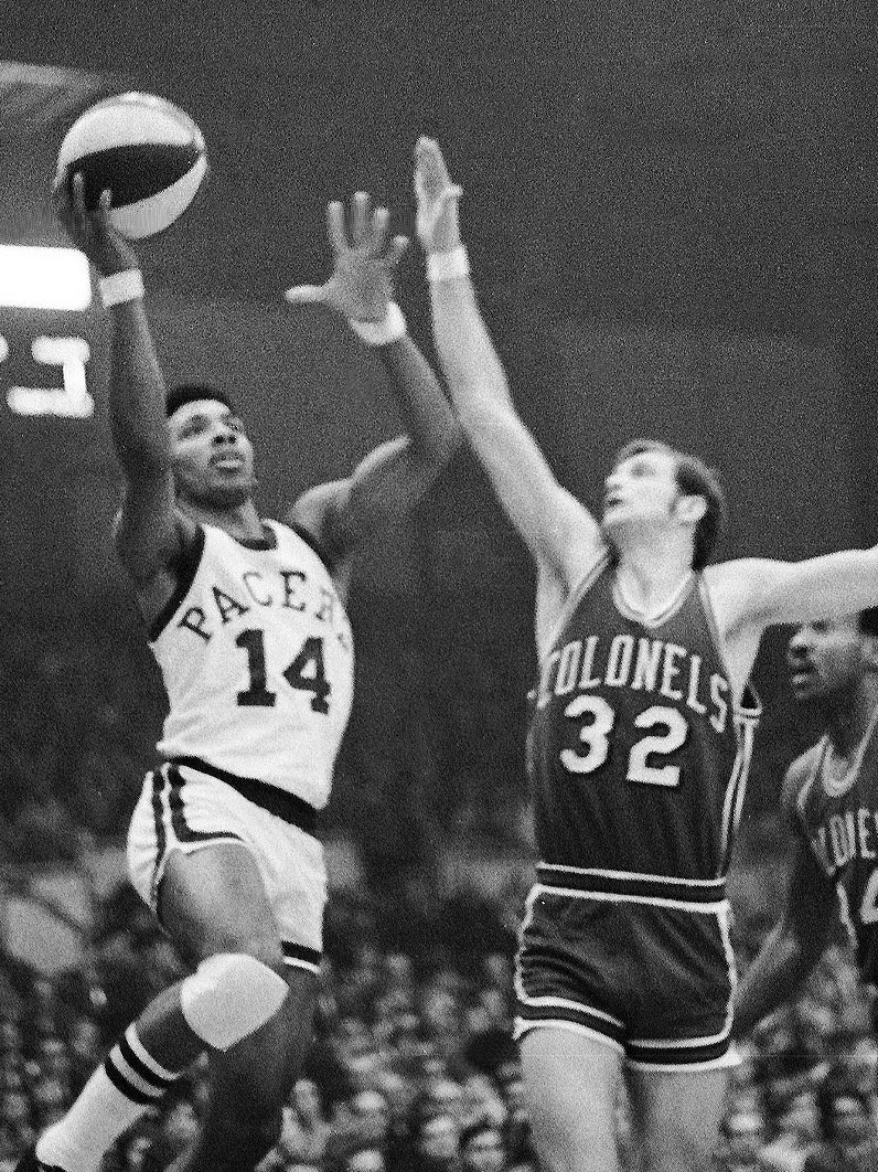 Freddy Lewis takes Kentucky Colonels’ star Dan Issel to the hoop.