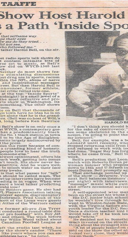 *Dave Aldridge (mentor)/ in a blog on NBA.com trying to support me, he screwed it up in one paragraph when he said, “For four decades, Harold Bell has told the truth as he saw it, on the airwaves or in print in Washington, D.C., he was the first African-American sports radio talk show host in DC. More recently, he’s been a no-holds barred internet columnist who regularly TRASHES sacred cows who forgot who they are and where they came from. He honors those in the black community who often don’t get recognition—both sports figures and regular folks.