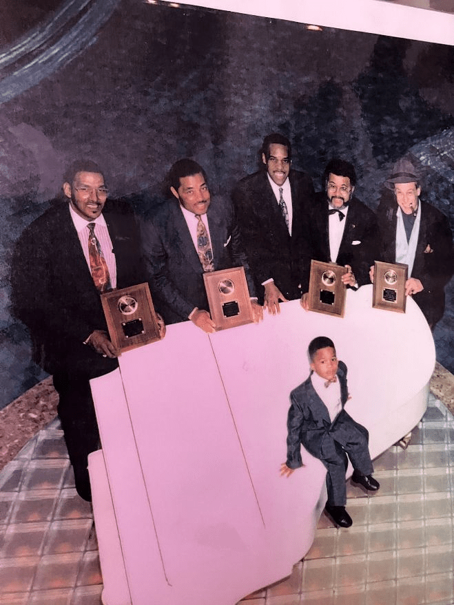 KIT Men of the Year “Reach Back Awards.” L-R Dr. George Logan-El-Clarence Edwards-HBell-Alex Williams and Boxing Historian, Bert Randolph Sugar. The 3-year-old sitting on the Grand Piano is Antonio Logan-El, HS All-American, a graduate of Towson State and now employed by DC Stay School-at Ballou High School.